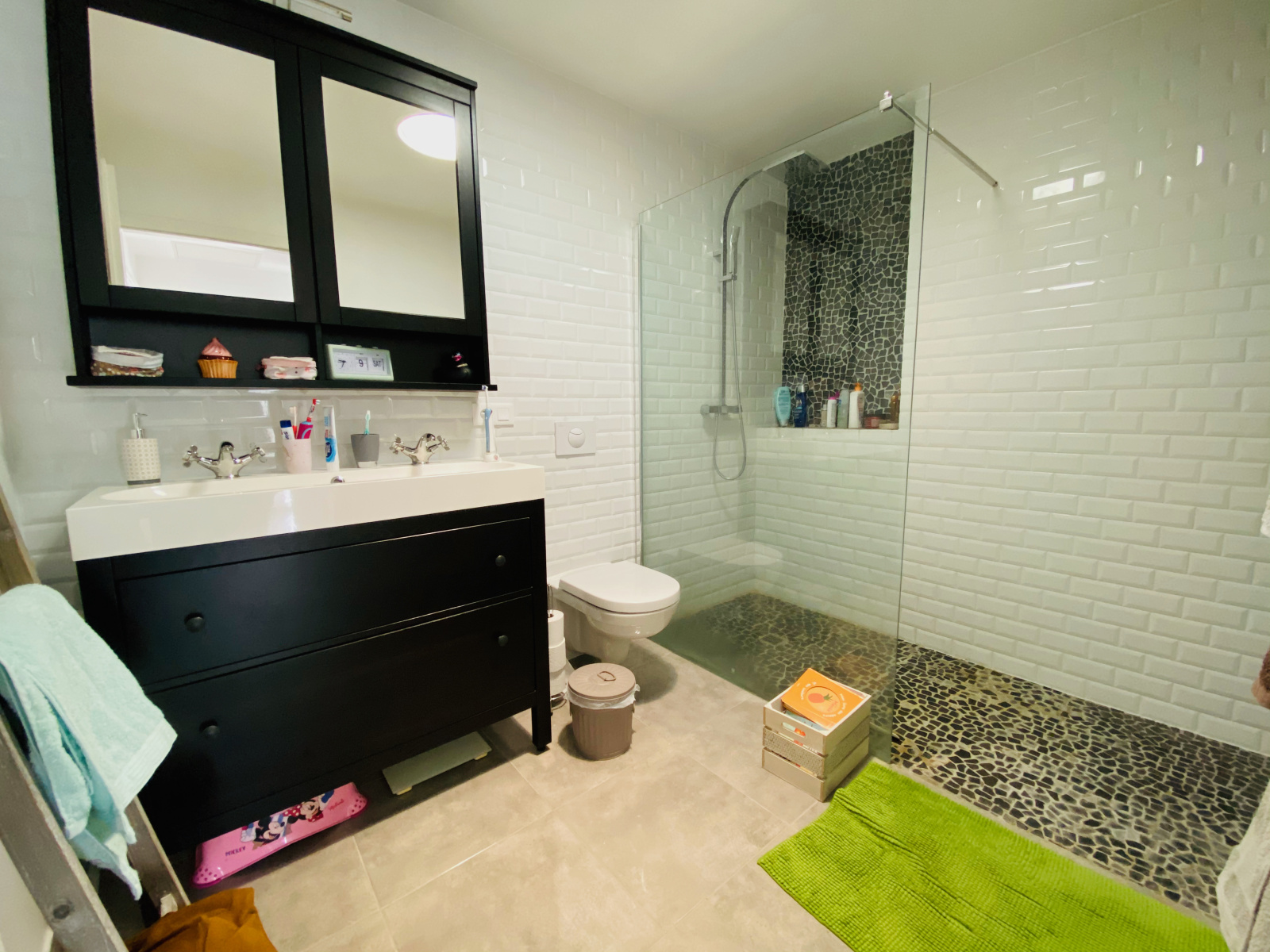 Achevé en 2016, il bénéficie de prestations particulières, comme le chauffage au sol au RDC, un puit de lumière naturel, une spacieuse douche à l’italienne dans la salle d’eau et une double vasque, un accès direct au garage et au parking par le Jardin et deux terrasses.