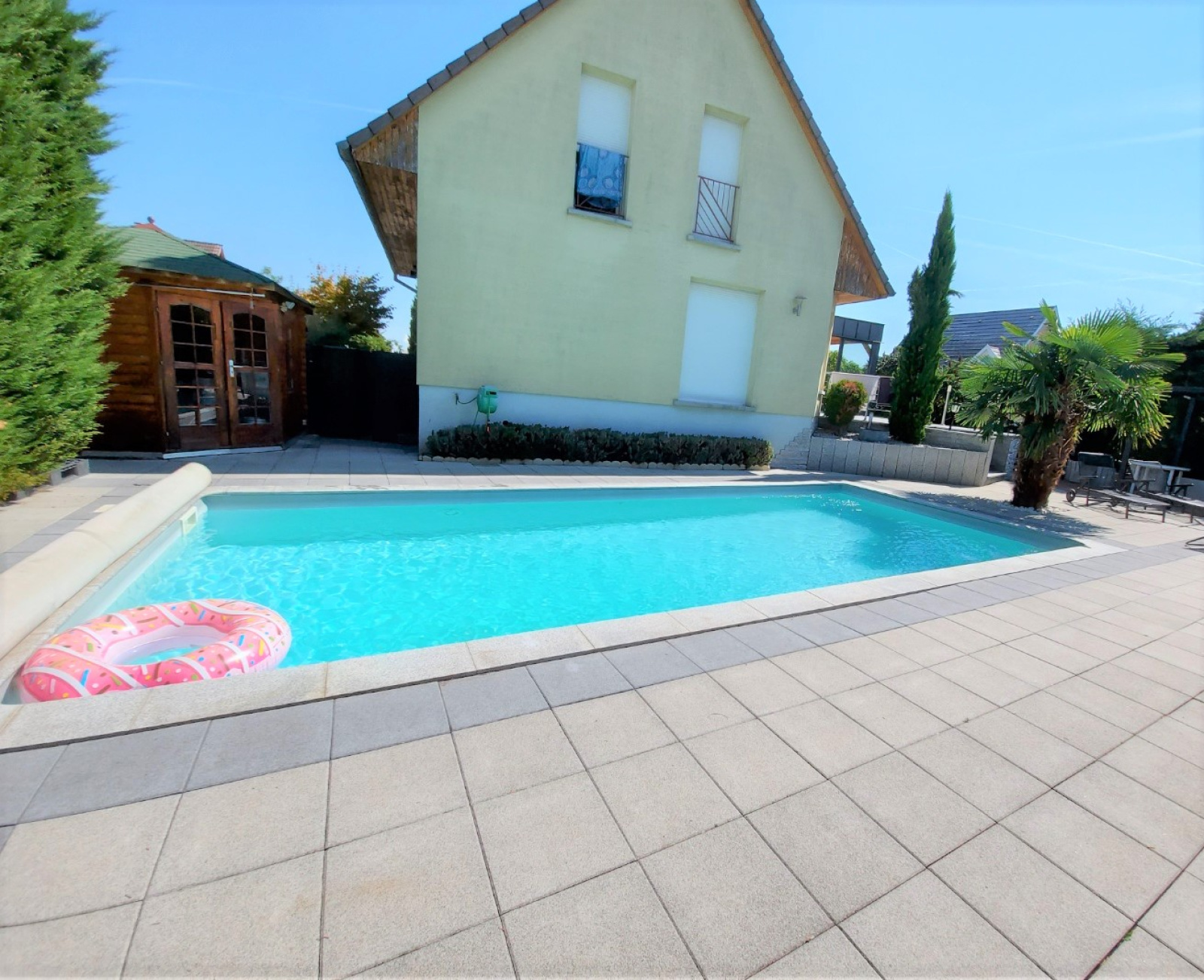 - Piscine de 4 x 8 m avec pompe à chaleur, terrain avec haie végétal tout autour, deux places de parking et une belle terrasse ensoleillée.