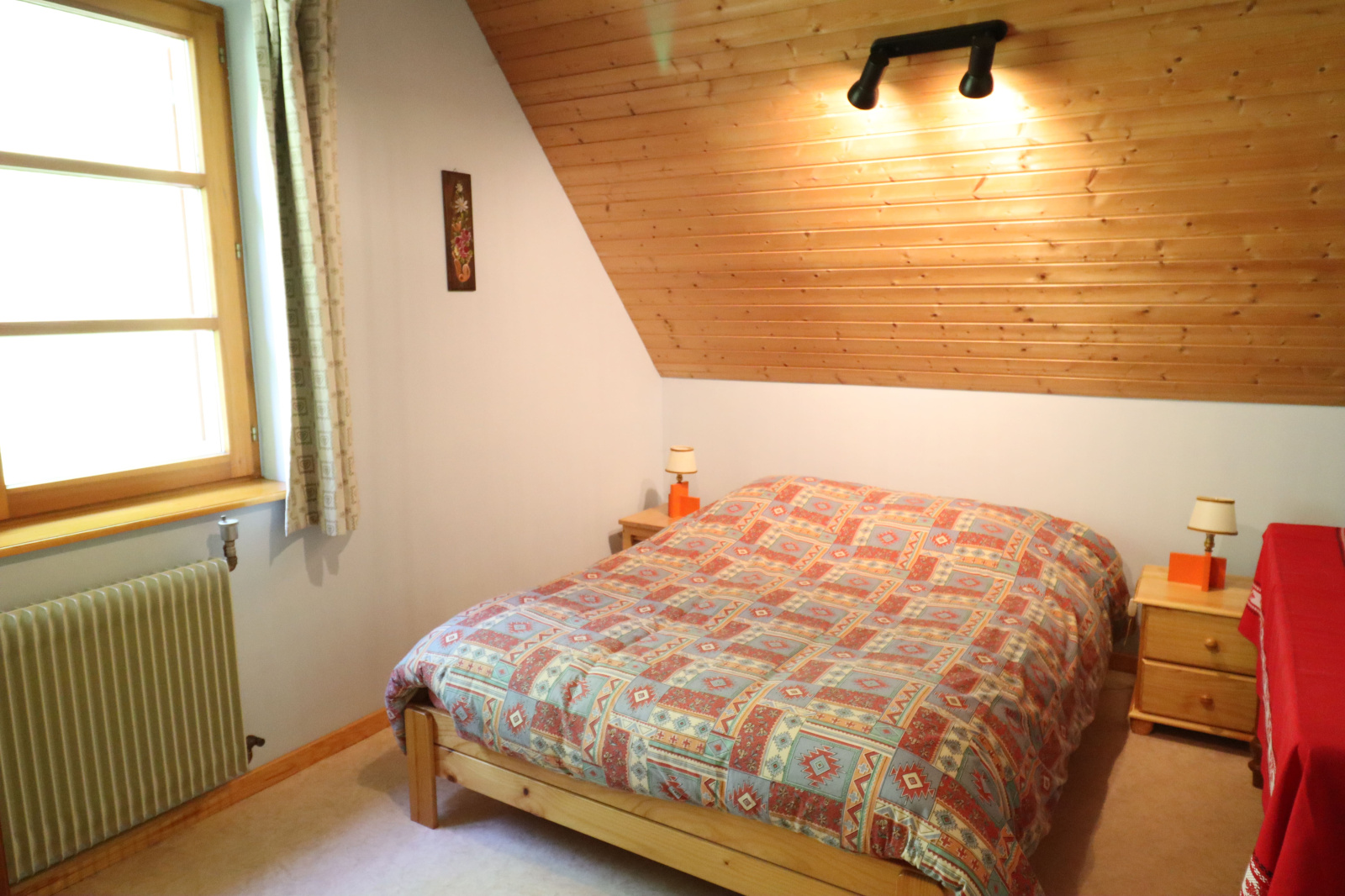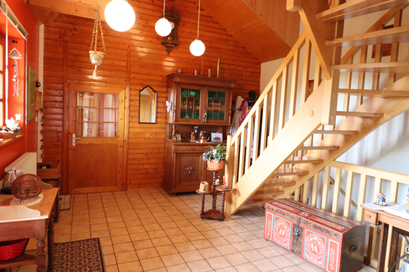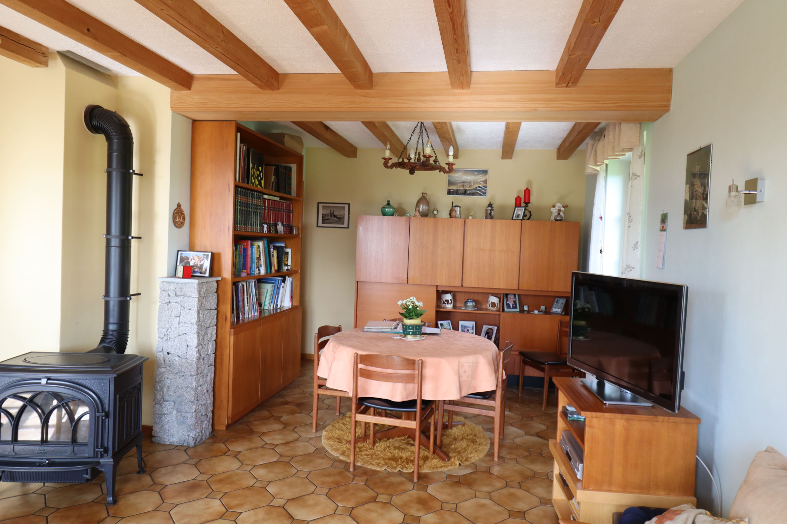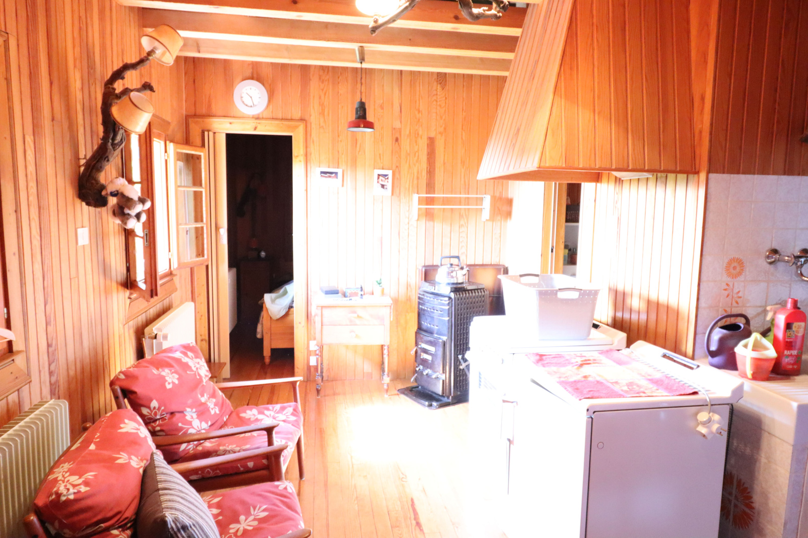- Une entrée donnant accés au chalet et à la partie plus récente qui donne accès sur une cuisine équipée, une salle à manger ouverte sur le salon, une salle de bain, un WC séparé et un débarras.