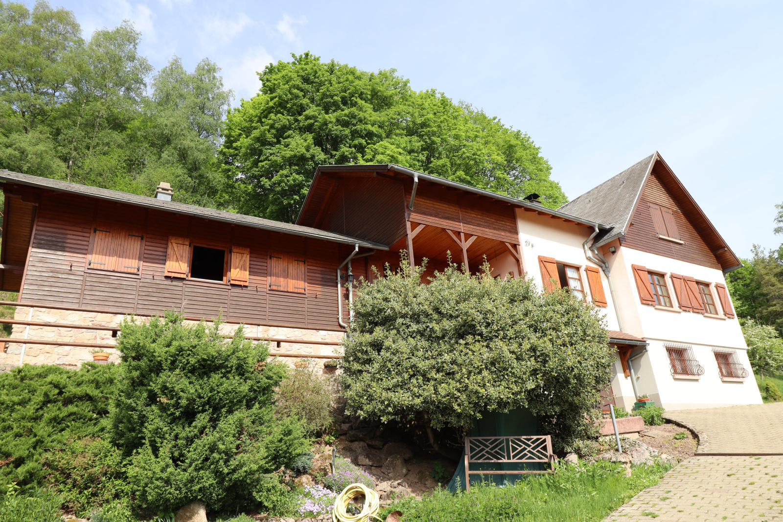 La maison d'environ 165 m2 est située sur un beau et grand terrain de 5944 m2 entièrement cloturé et avec une vue dégagée, elle bénéficie d'une partie style chalet et d'une partie maison traditionnelle avec de grandes pièces à vivre.